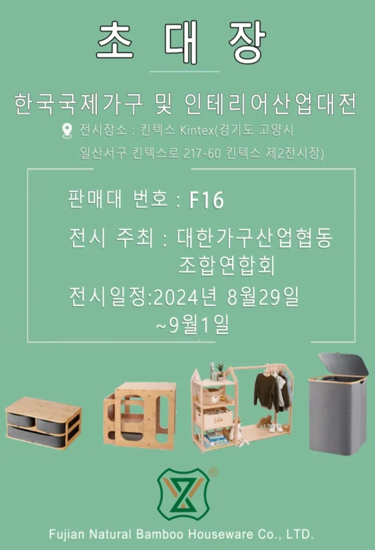 Fujian Natural Bamboo Houseware Co., Ltd is excited to announce its upcoming furniture exhibition in Korea. The event will take place from August 29 to September 1, 2024, showcasing a wide range of their exquisite bamboo houseware products.