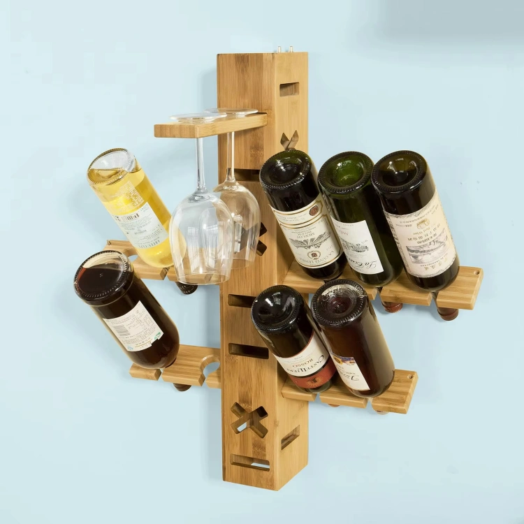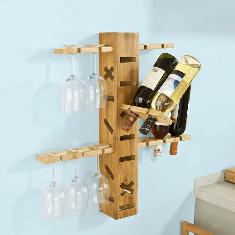 Wall Mounted Wine Glass Rack is crafted from high-quality natural wood, combining elegance with functionality. The unique cross-structure design provides a stable and stylish display, capable of holding up to 6 wine bottles. It features dedicated grooves for hanging 2-4 wine glasses, making it a perfect addition for wine enthusiasts. The space-saving wall-mounted design seamlessly integrates into kitchens, dining rooms, or home bars, turning your wine collection into a decorative feature. Easy to install and sturdy in construction, it adds a touch of sophistication to any space. Whether for daily use or as a thoughtful gift for wine lovers, this wine rack enhances both convenience and style.